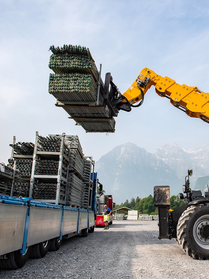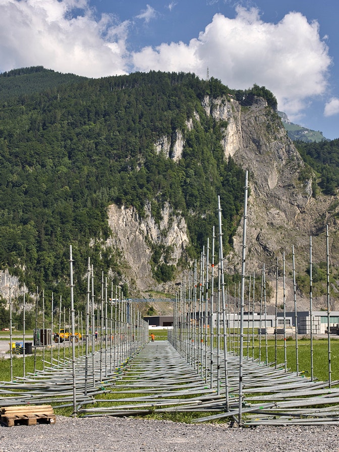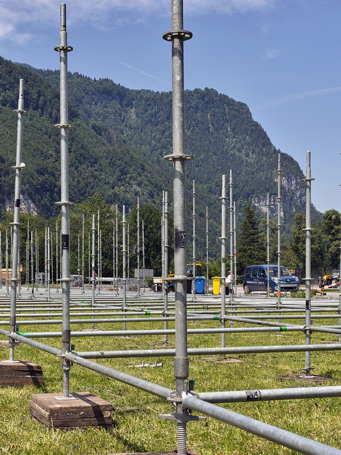«Das Festgelände liegt auf rund 55 Hektar Land. Die darin befindliche Glarnerland-Arena umfasst 850 m, hat einen Durchmesser von 250 m und ist 17,5 m hoch. Sie bietet 56‘500 Zuschauerinnen und Zuschauern mit gedeckten Sitz- und Stehplätzen beste Sicht auf das Geschehen im «Sägemehl» erklärt der Projektverantwortliche Danilo Della Ca. «Für den Bau der sechs Tribünen sind insgesamt circa 3000 t Tribünenmaterial nötig, bestehend aus Unterkonstruktion, Dachelementen und Sitzen. Aufgrund der temporären Bauweise können alle Elemente wiederverwendet werden; einige davon waren vor drei Jahren bereits am ESAF in Pratteln im Baselland im Einsatz.»