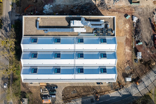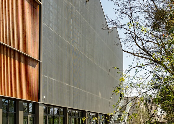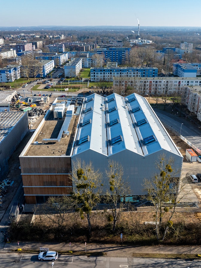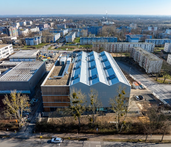 Die Elementbauweise ermöglichte eine erhebliche Zeitersparnis gegenüber konventionellen Bauweisen und verkürzte die Arbeiten auf der Baustelle. Der laufende Schulbetrieb und der Verkehr in der Umgebung wurden nur geringfügig beeinträchtigt. Die bis zu 41 Tonnen schweren Bauteile der Hybridkonstruktion aus Holz, Stahl und Beton, davon allein 600 Holzelemente, wurden mit Schwertransportern angeliefert und mit einem hochbelastbaren Teleskopbaukran montiert.