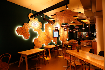 Die Decken- und Wandverkleidungen wurden nach Designvorgaben CNC gefräst und an Stahlseilen abgehängt montiert und hinterleuchtet.