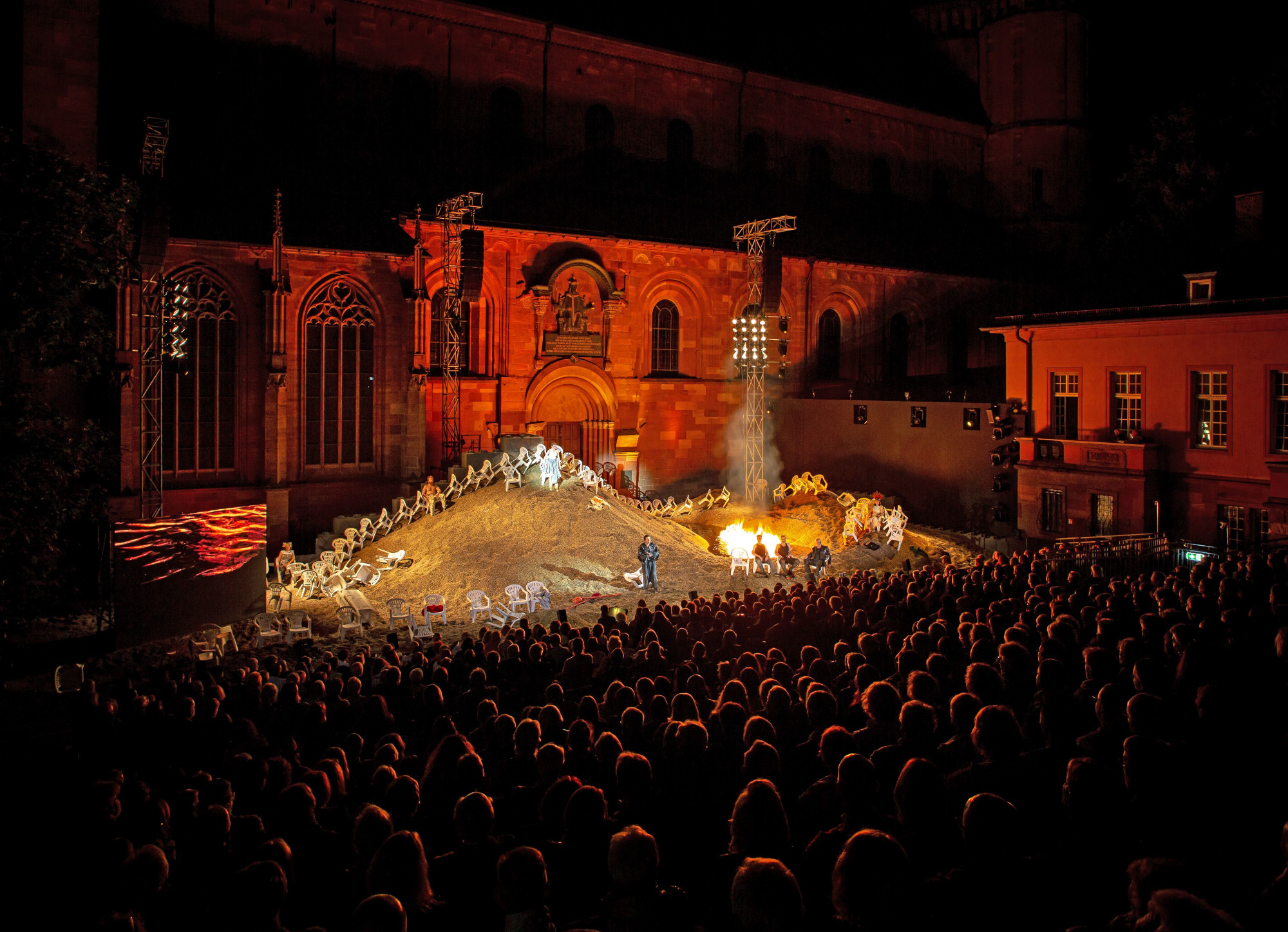 Am Originalschauplatz der Nibelungensage – in Worms und dort direkt vor dem historischen Dom – finden jährlich im Sommer die Nibelungen Festspiele statt. Jedes Jahr errichtet NÜSSLI dafür eine grosse Tribüne inklusive Schallschutzwand. Auch das imposante Bühnenbild liefert und montiert das NÜSLLI Team.