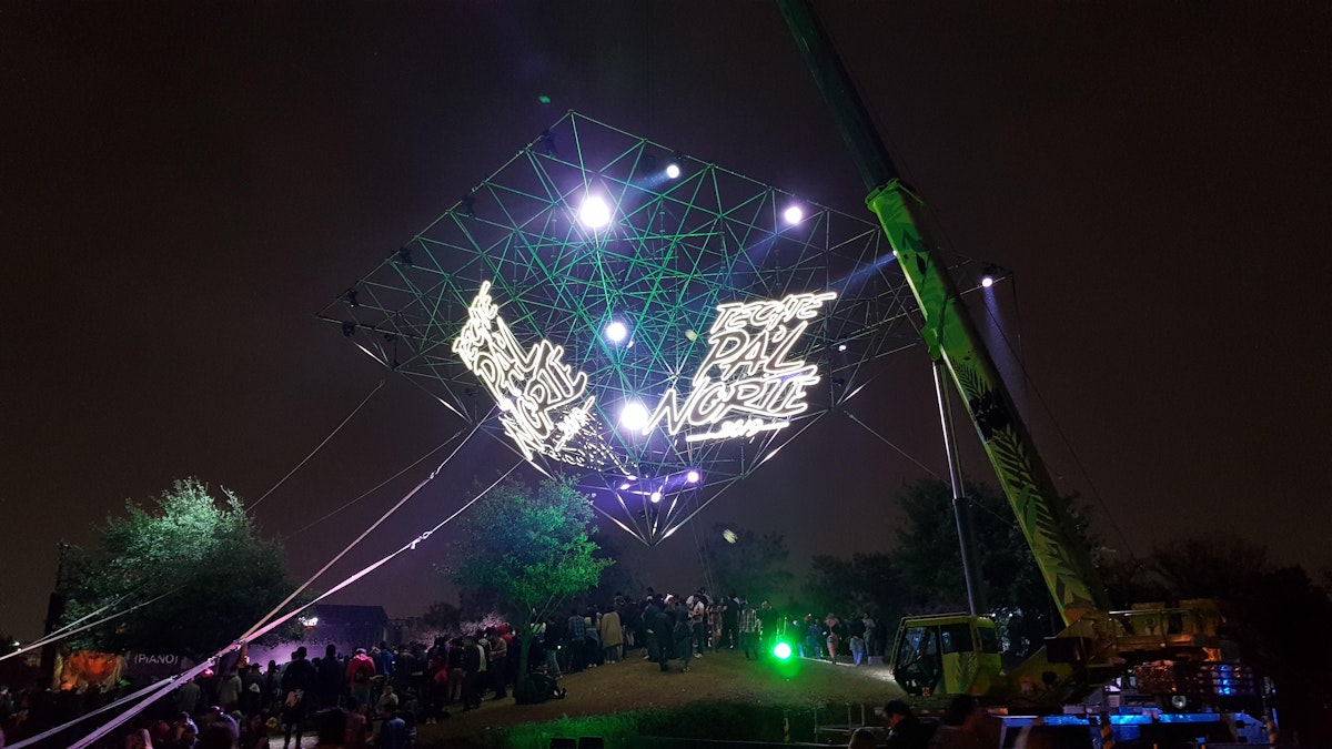 Eine fliegende Pyramide begrüsste die Musikfans am Eingang des Festivals Pa’l Norte in Mexiko. Ein grosser Kran hielt die 16x16x8 Meter grosse Pyramide in Position. Die besondere Form und die gesamte Lichtausstattung machten das Dreieck zu einem echten Hingucker.