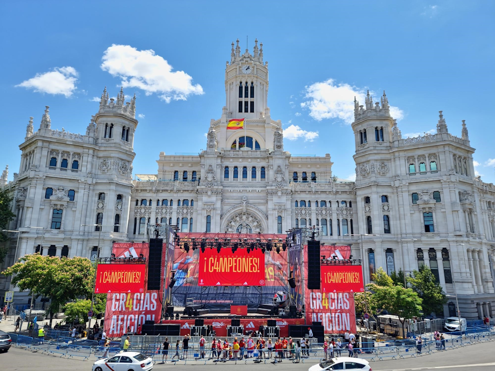 Im Herzen der spanischen Hauptstadt, auf der Plaza de Cibeles, feierten die spanischen Fans ihre frisch gekrönten Champions der Fussballeuropameisterschaft. Um die jubelnden Bilder für alle sichtbar zu machen, installierten wir verschiedene Bildschirme rund um den ikonischen Brunnen. Ausserdem haben wir die beeindruckende Hauptbühne für die Feierlichkeiten aufgebaut. Wir sind stolz darauf, Teil dieses historischen Moments zu sein!