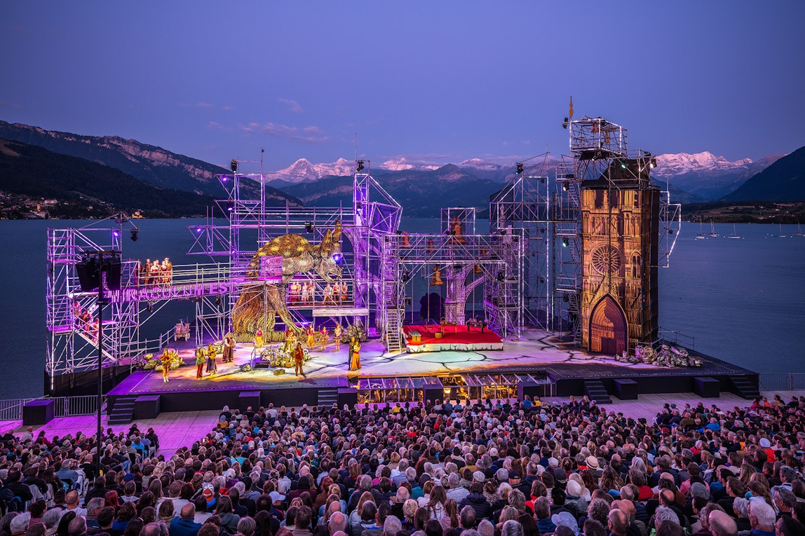 Vor dem atemberaubenden Panorama von Eiger, Mönch und Jungfrau im Berner Oberland steht die Thuner Seebühne im Wasser. Weltklasse-Aufführungen wie "Aida - Das Musical" oder "Alfa Romeo" locken jedes Jahr über 70.000 Besucher an den Thunersee. Seit Beginn der Thunerseespiele mit dabei, steuert NÜSSLI jährlich die Bühnenkonstruktion mit integriertem Orchestergraben, Tribüne, Sponsorenplattform sowie Regie mit VIP-Podest zu den Freilichtspielen bei.