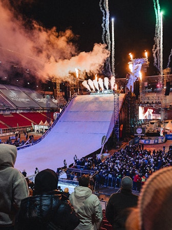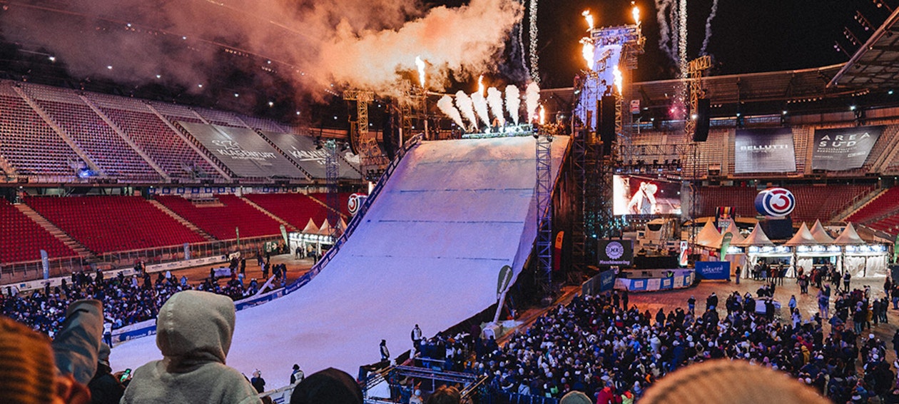 Freeskier und Snowboarder. Abends, nach den sportlichen Wettkämpfen, verwandelte sich das ganze Stadion in eine Party-Location und wurde die Rampe zur Bühne für die Aftershow mit internationalen
