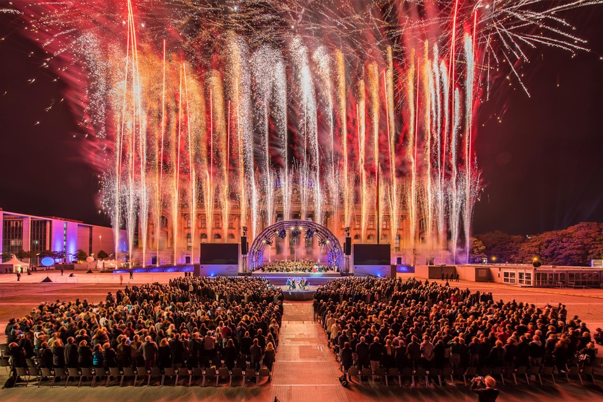 As part of the celebrations for the 25th anniversary of the reunification of Germany, the President of the country issued an invitation for a ceremony on Platz der Republik on October 3, 2015. Customized event structures by NUSSLI, from the stage to the press and camera platform, contributed to the success of the event.