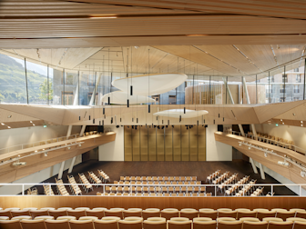 At 1400 metres above sea level, an unusual concert hall was built after a total construction period of around two years. Equipped with state-of-the-art technology, it offers up to 650 seats and a stage for a 75-person orchestra. Commissioned by Lindner AG, NUSSLI was responsible for the interior design of this modern complex.