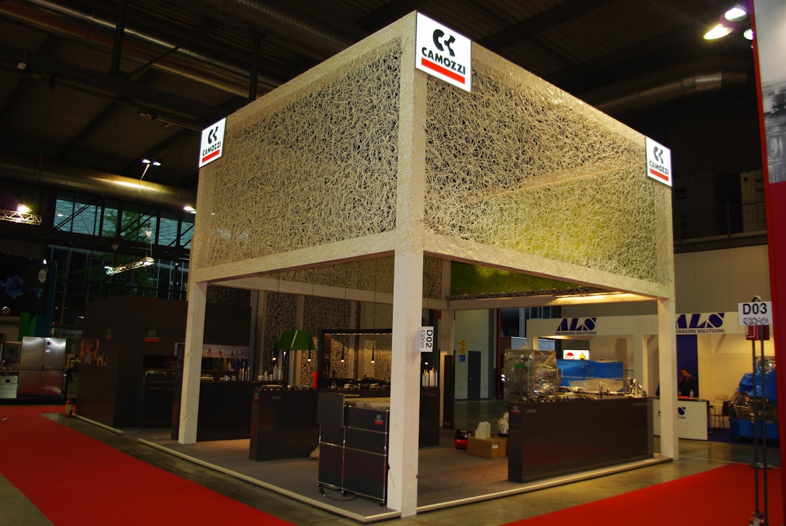 The IPACK IMA in Milan is a trade exhibition in the food industry sector. The aim of the event is the visibility of the tradition, creativity and innovation. The NUSSLI Group was responsible for the wooden cube stand for Camozzi. Wood - used as the main material for the booth construction followed by mesh for the cover - made this booth very unique.