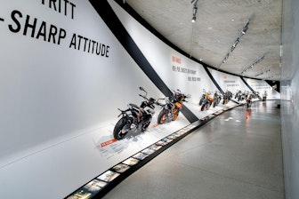 Around 70 street and off-road bikes race on a banked bend built by NUSSLI and lead up to the exhibition's highlight, the "Heroes of Racing." This is where visitors encounter the most daring and successful drivers of all time. Over 200 original trophies can be admired floating in the air, which required a great deal of finesse to assemble. Last but not least, the people behind the brand speak about their passion for KTM and give the company a personal touch.