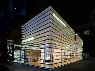 NUSSLI Ambrosius constructed a premium trade fair booth with several bathroom designs and a wooden facade for the Swiss brand Laufen.