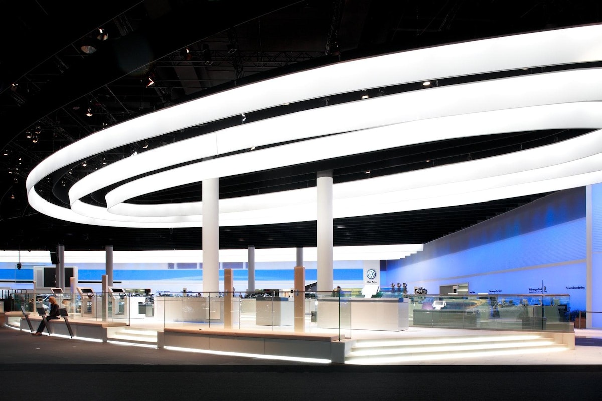 NUSSLI constructed the large exhibition stand of Volkswagen with several presentation areas and a special ceiling element.
