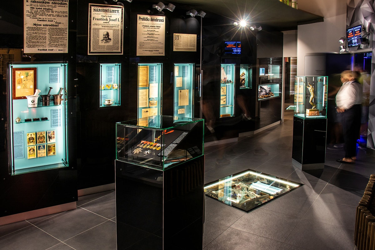 Since July 2021, a comprehensive exhibition at the National Museum in Prague has been showcasing 20th century Czech history. The planning and preparation for the new permanent exhibit spanned eight years. NUSSLI was part of the team and staged the exhibits with classy black walls and panels with blue LED strips. NUSSLI also delivered the display cases and pedestals for statues.