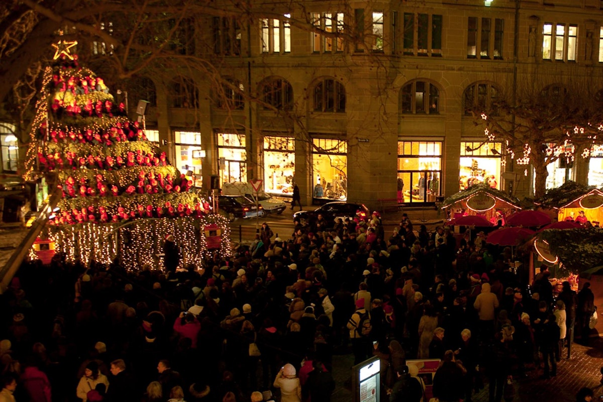 For more than 25 years, NUSSLI has been setting up the Singing Christmas Tree. Year after year, the Christmas tree made of NUSSLI system material provides a special stage for a pleasant, musical atmosphere on the Werdmühleplatz in Zurich.
