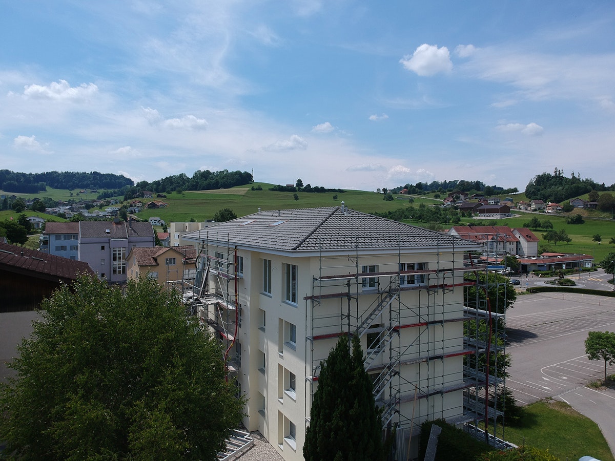 Un edificio de viviendas de Bazenheid deseaba incrementar su altura, por lo que lo ampliamos. El equipo de NUSSLI instaló en el edificio existente otra planta, así como un nuevo ático. Fue necesario emplear los servicios de nuestra producción de madera. Tanto en las cuatro nuevas viviendas como en el techo se emplearon módulos de madera prefabricados y aislados. También nos encargamos del pavimento. La entrega de todos los elementos necesarios en la construcción se planificó con exactitud y se adaptó a cada fase del montaje.