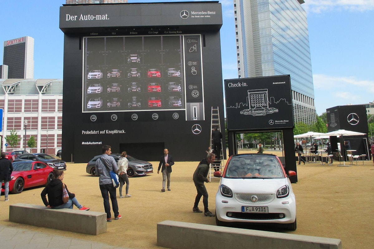 Imagínese una máquina expendedora gigante y una moneda. Según el lema «Introducir, subir y disfrutar» Mercedes-Benz ofreció a los visitantes una prueba de marcha espectacular con solo pulsar un botón en su máquina expendedora. Para la exposición itinerante, NUSSLI construyó junto con AMBROSIUS un simulador de conducción en formato XL.
