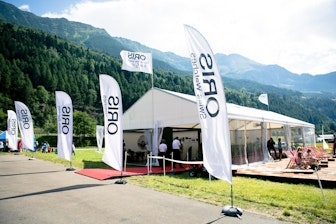 El fabricante de clientes ORIS presentó un especial evento para un cliente en el corazón de los Alpes suizos. Se levantó un pabellón instalado en el aeródromo, similar a un lounge sobre una estructura con la base de madera con láminas de bangkirai. Las vitrinas de la exposición, una barra de var, mesas altas y distintos taburetes completaron el trabajo del grupo NUSSLI.