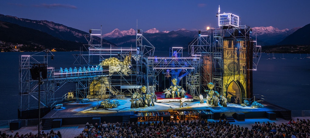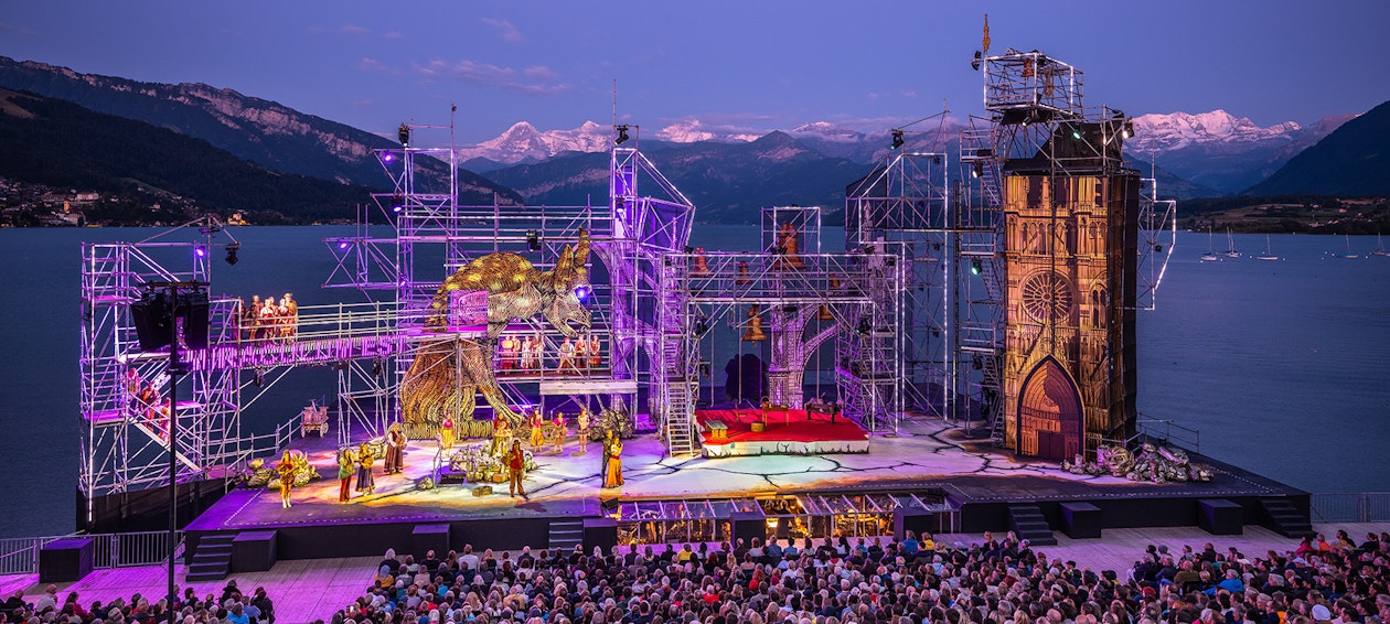 The Lake Thun stage rises from the water against the breathtaking panorama of the Eiger, Mönch and Jungfrau mountains in the Bernese Oberland. World-class performances such as "Aida - The Musical" and "Alfa Romeo" attract more than 70,000 visitors to Lake Thun every year. On hand since the beginning of the Lake Thun Festival, NUSSLI has assumed annual responsibility for managing the construction of the stage with an integrated orchestra pit, a grandstand, and a sponsors' platform as well as stage direction with a VIP platform for the open-air theater.