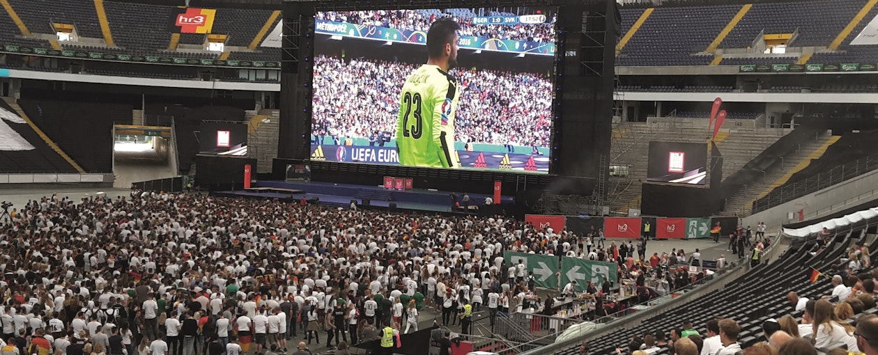 Pour les matchs du championnat d'Europe de football 2016, NUSSLI a transformé la Commerzbank Arena de Francfort en un lieu pour une énorme fête du football et y a installé le plus grand écran de projection publique d'Allemagne. L'équipe de projet a intégré la structure porteuse modulaire pour l'écran LED de 41 mètres de large et 14 mètres de haut directement dans la scène de 240 m². Deux écrans LED plus petits, placés de chaque côté, complétaient le grand écran. Outre les retransmissions en direct des matchs de l'Allemagne, les spectateurs ont pu y profiter d'un excellent divertissement avec des concerts de musique live et différentes offres de street food.