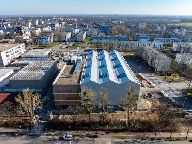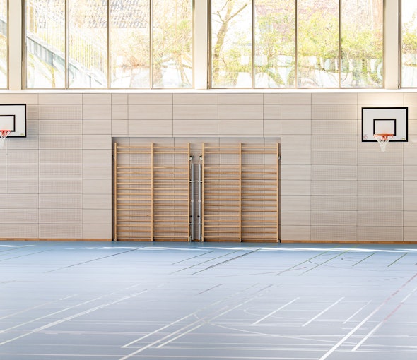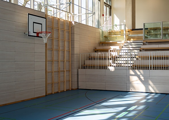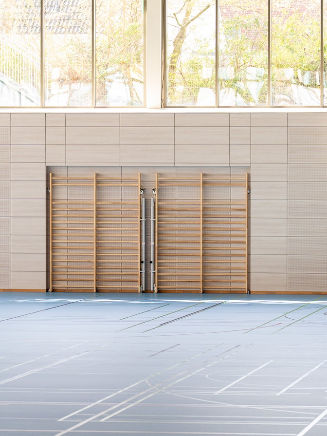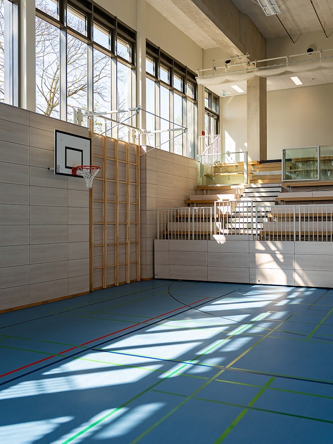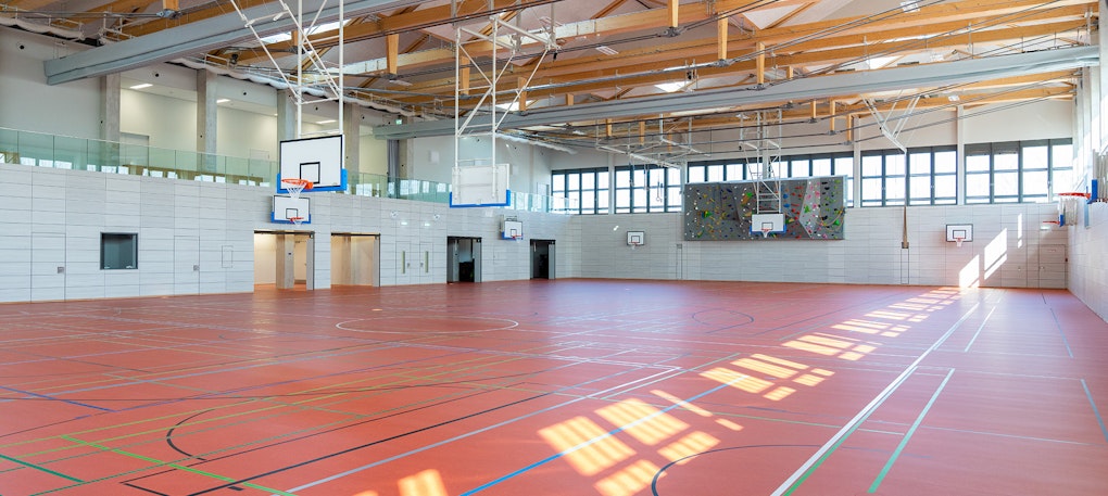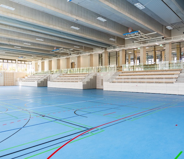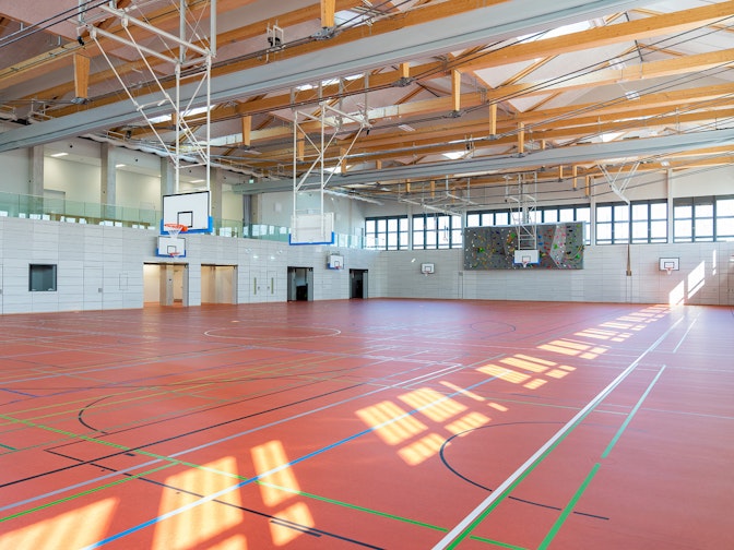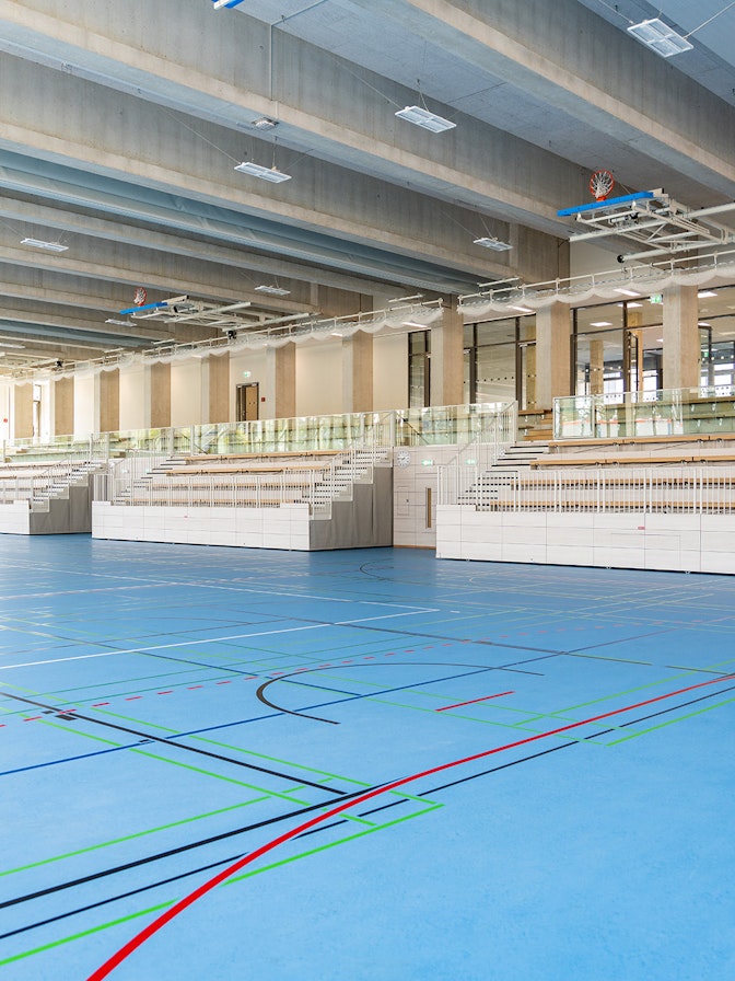 Per la città di Monheim am Rhein, il nuovo palazzetto dello sport a otto campi sul terreno del centro scolastico Berliner Ring è un importante luogo di incontro e di identificazione. Il palazzetto dello sport a otto campi offre un'ampia flessibilità e possibilità di praticare sport e giochi su due livelli, con un totale di 4400 m² di spazio sportivo puro. Quattro unità del palazzetto possono essere utilizzate come palazzetto a otto campi o come due palazzetti a quattro campi, a seconda delle esigenze. Gli spogliatoi, i locali sanitari e tecnici, i magazzini, le scale e il foyer si estendono su altri 3000 m². Per gli eventi con pubblico è disponibile una tribuna telescopica retrattile con 500 posti a sedere.