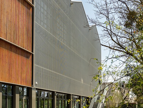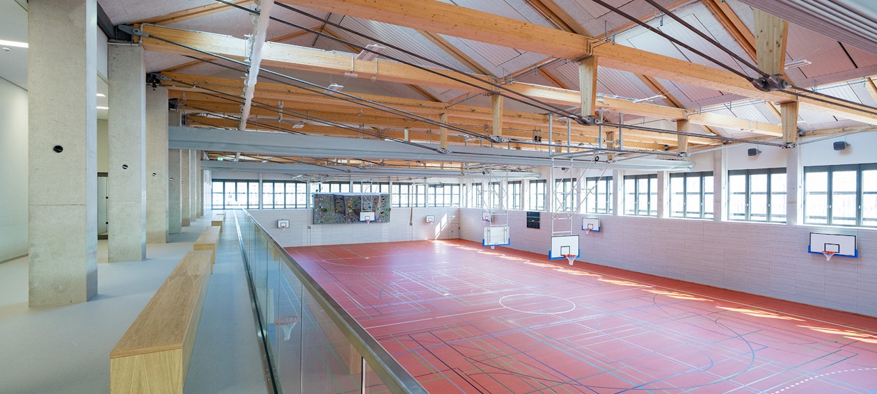 Per integrarsi visivamente con l'ambiente circostante, il campo da gioco principale dell'imponente edificio è stato abbassato di un piano, in modo che il palazzetto dello sport inferiore con la tribuna telescopica si trovi a cinque metri sotto il livello del suolo. La facciata in lamiera forata grigio chiaro a cortina conferisce al palazzetto dello sport un aspetto esterno notevole. L'edificio adiacente con foyer, spogliatoi, servizi igienici e locali tecnici è stato dotato di una caratteristica facciata in legno di larice. La sezione del palazzetto è costituita da elementi prefabbricati in cemento armato, travi in cemento armato precompresso e travi in legno sottotese. La struttura portante dell'annesso è una costruzione in legno composta da lastre piane, pareti e colonne.
